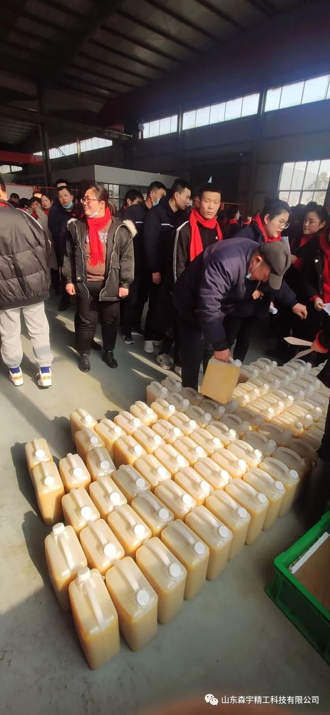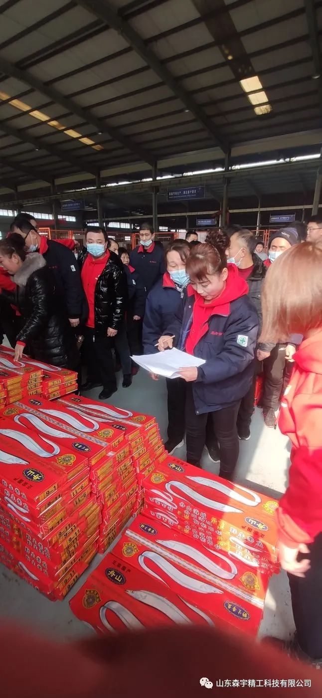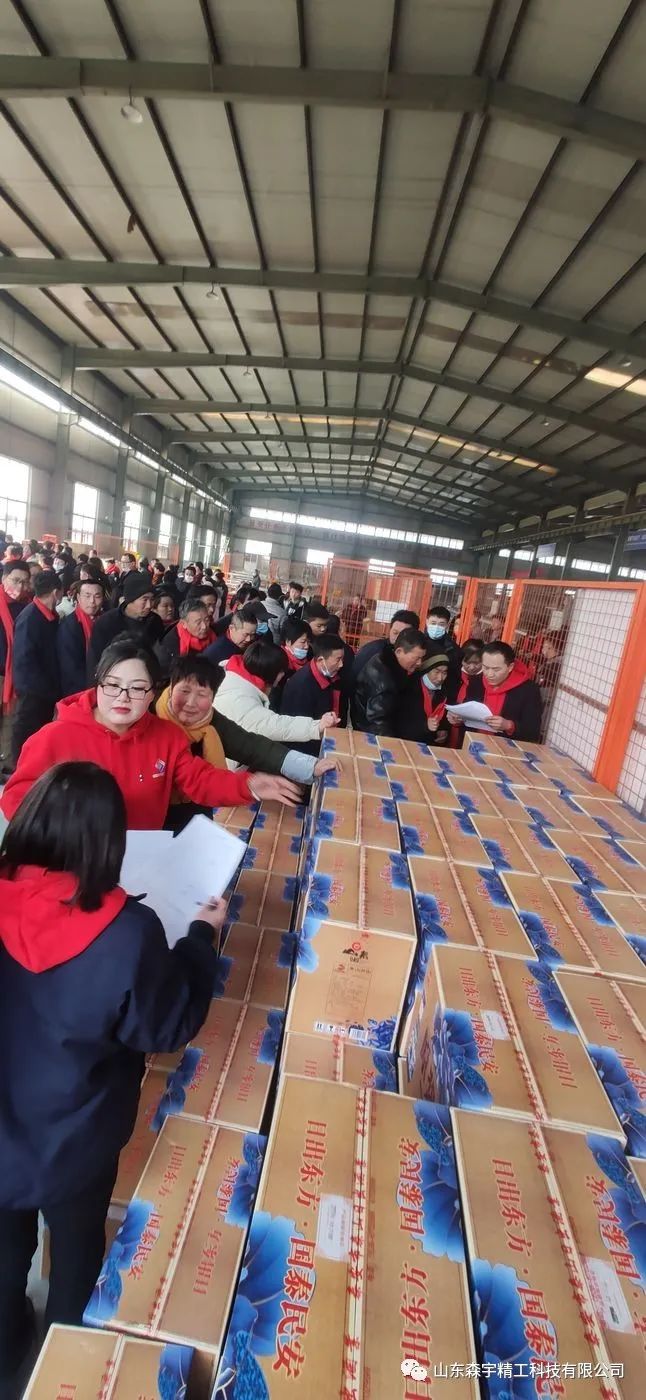 演出結(jié)束后,大家來(lái)到不銹鋼車間倉(cāng)庫(kù),福利發(fā)放現(xiàn)場(chǎng)猶如趕年集一般熱鬧。大家在歡聲笑語(yǔ)中,領(lǐng)到公司準(zhǔn)備的多種福利,有:精美的泰山酒,滿屋飄香的紅富士大蘋果,整整齊齊、沉甸甸的東海大帶魚以及自家十斤現(xiàn)榨花生油!
